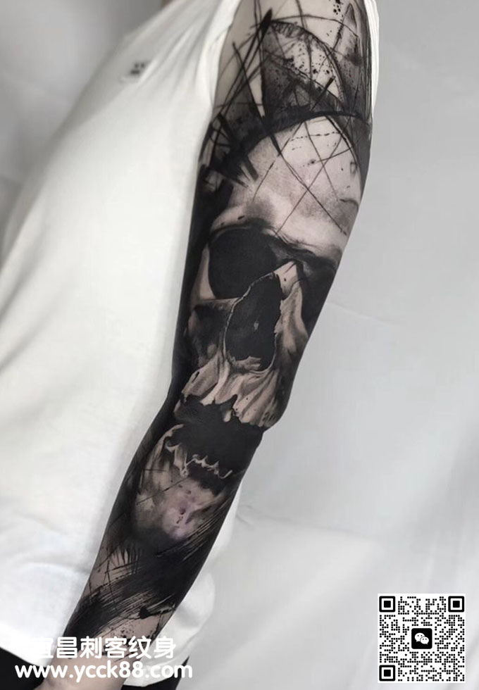 暗黑风格骷髅花臂纹身 查看更多人体个性纹身图案请登入宜昌刺客纹身网 www.ycck88.com