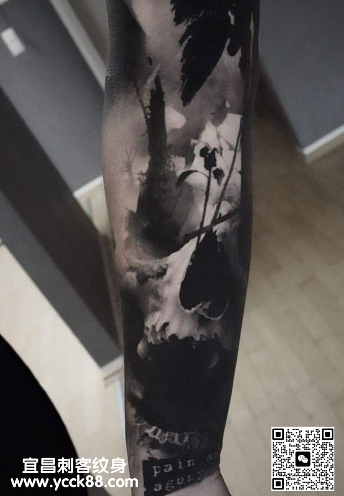 暗黑风格花臂骷髅纹身 查看更多人体个性纹身图案请登入宜昌刺客纹身网 www.ycck88.com