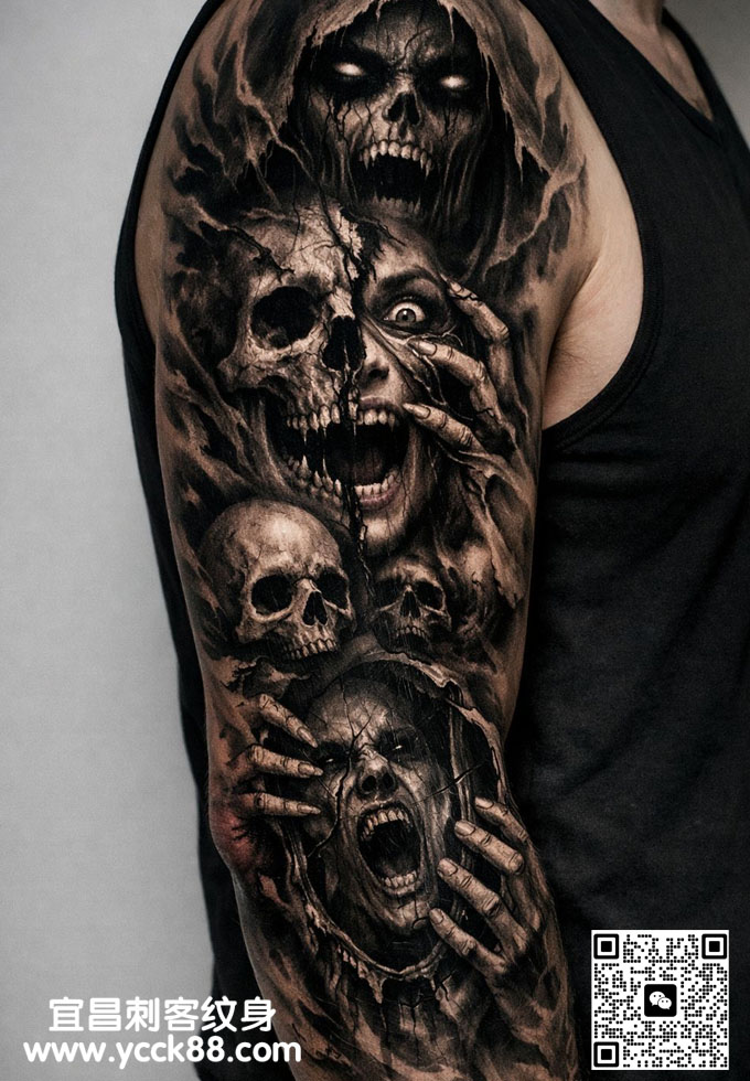 花臂骷髅纹身 查看更多人体个性纹身图案请登入宜昌刺客纹身网 www.ycck88.com