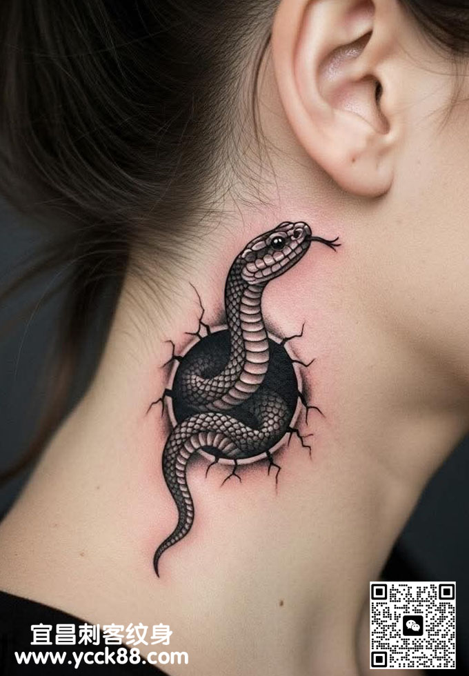 美女颈部3D风格蛇纹身图案图片 更多纹身图案请登入宜昌刺客纹身网 www.ycck88.com