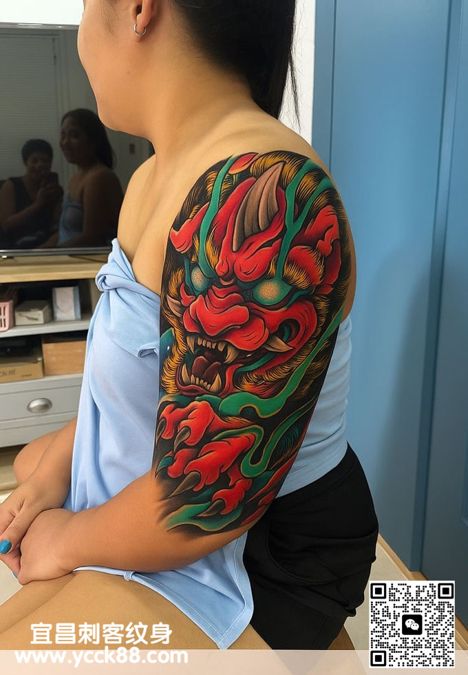 胳膊彩色唐狮纹身图案