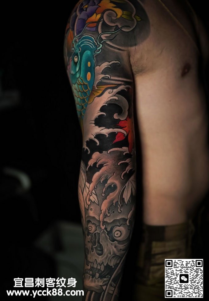 彩色鲤鱼花臂纹身图案 更多纹身图案请登入宜昌刺客纹身网 www.ycck88.com