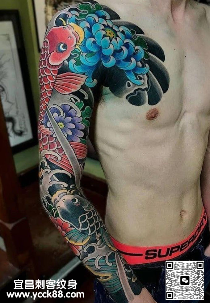 老传统花臂鲤鱼纹身 查看更多人体个性纹身图案请登入宜昌刺客纹身网 www.ycck88.com