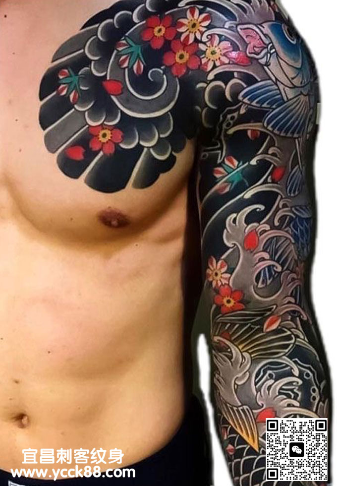 老传统半甲花臂鲤鱼纹身 查看更多人体个性纹身图案请登入宜昌刺客纹身网 www.ycck88.com