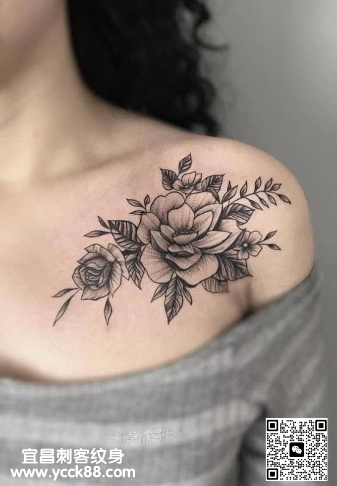美女锁骨素花纹身 查看更多人体个性纹身图案请登入宜昌刺客纹身网 www.ycck88.com