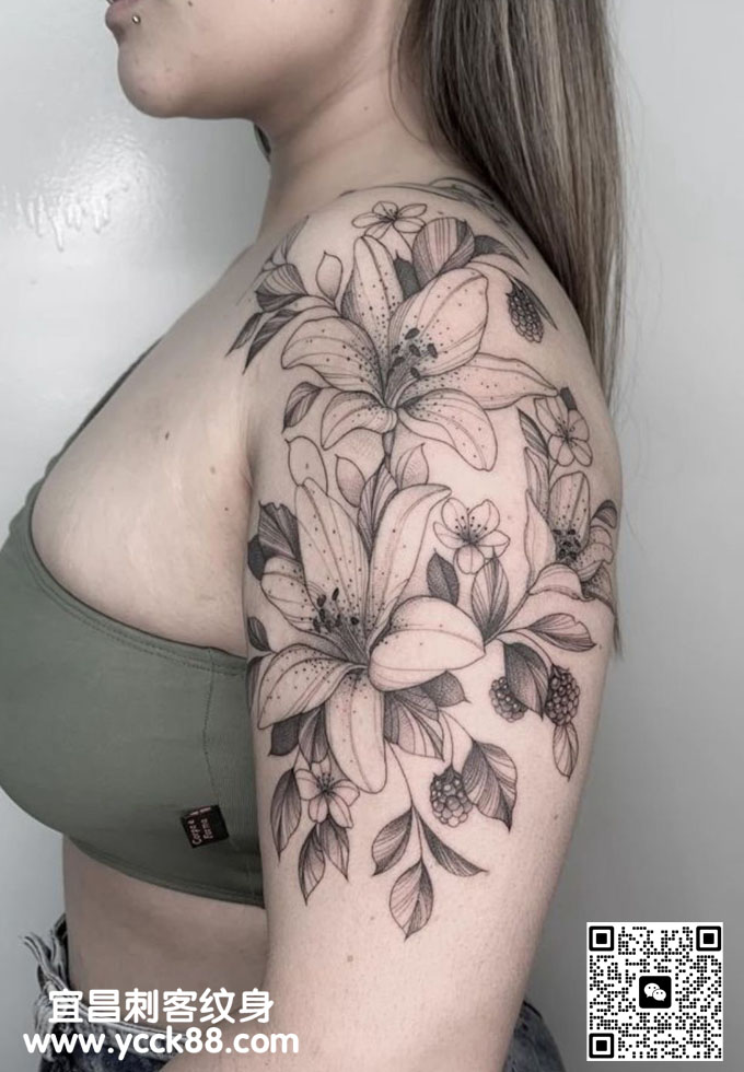 美女大臂素花纹身 查看更多人体个性纹身图案请登入宜昌刺客纹身网 www.ycck88.com
