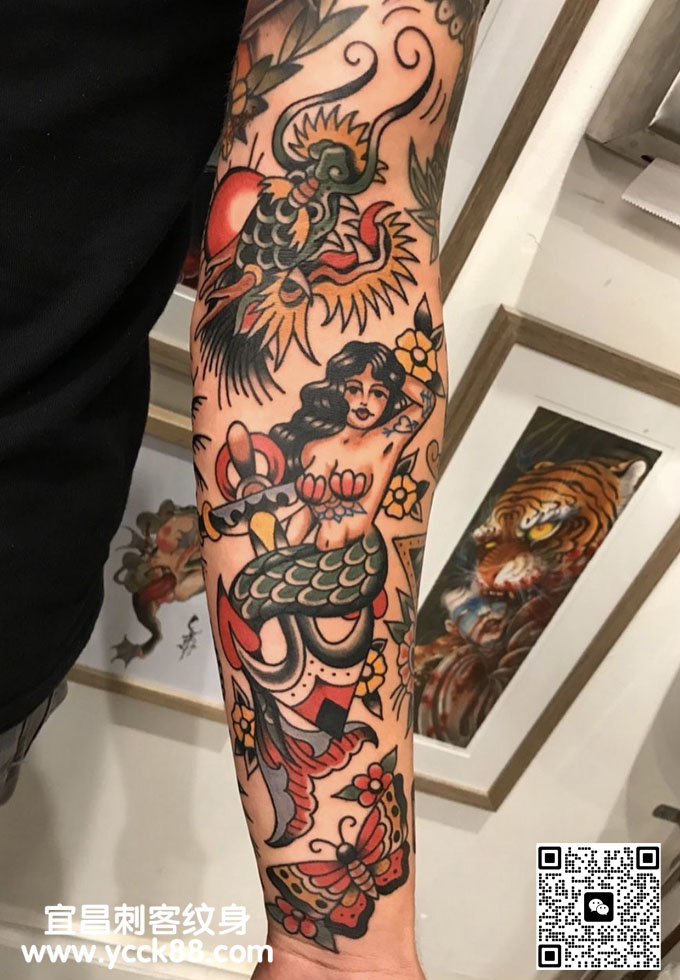 old school彩色花臂纹身 查看更多人体个性纹身图案请登入宜昌刺客纹身网 www.ycck88.com