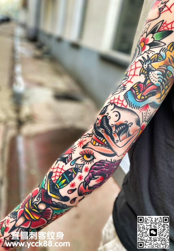 old school彩色花臂纹身 查看更多人体个性纹身图案请登入宜昌刺客纹身网 www.ycck88.com