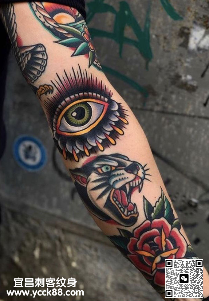 old school彩色花臂纹身 查看更多人体个性纹身图案请登入宜昌刺客纹身网 www.ycck88.com