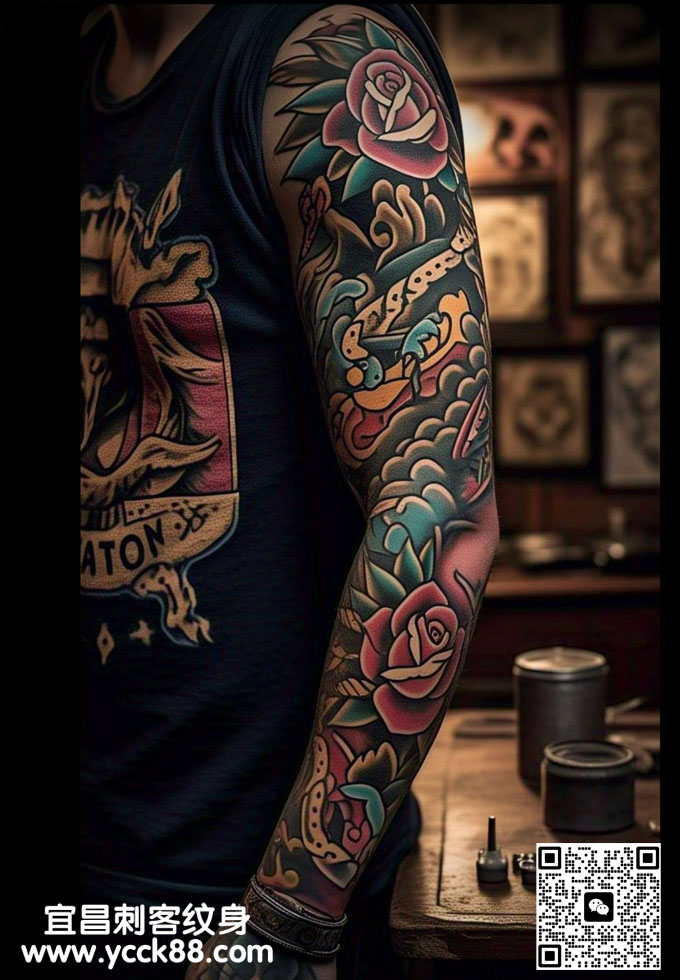 old school彩色花臂纹身 查看更多人体个性纹身图案请登入宜昌刺客纹身网 www.ycck88.com
