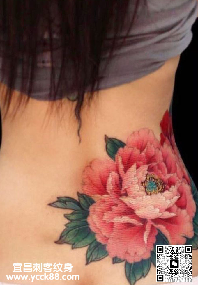 腰部水彩牡丹纹身 查看更多人体个性纹身图案请登入宜昌刺客纹身网 www.ycck88.com