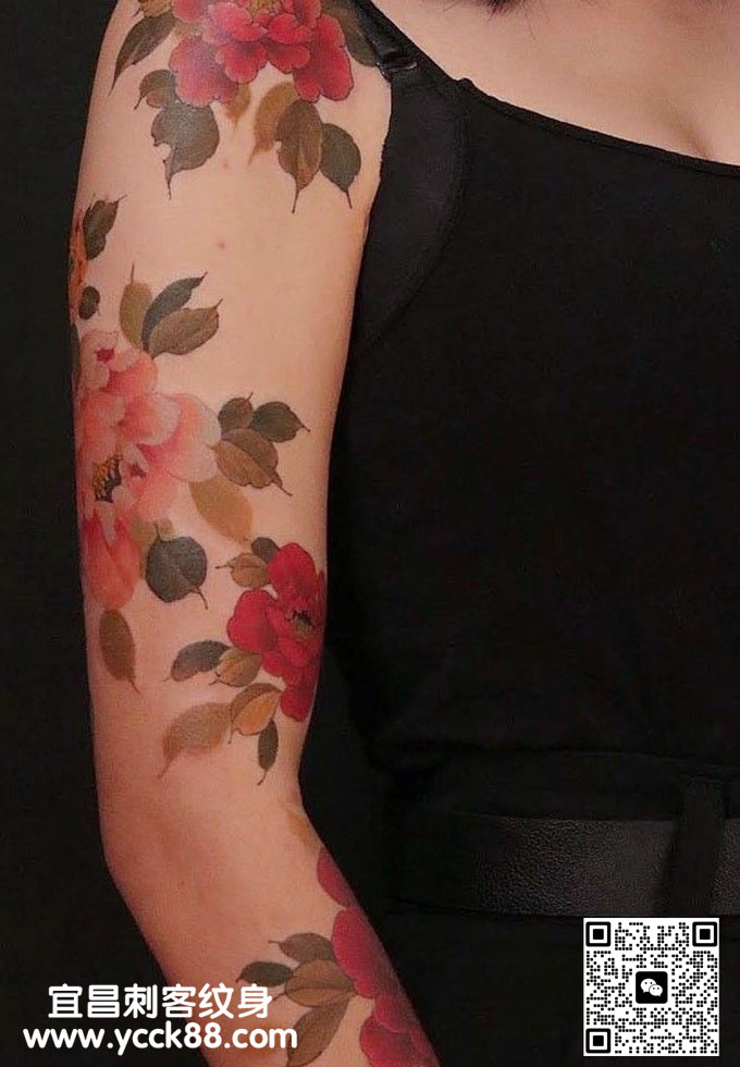 牡丹花花臂纹身风格纹身 查看更多人体个性纹身图案请登入宜昌刺客纹身网 www.ycck88.com