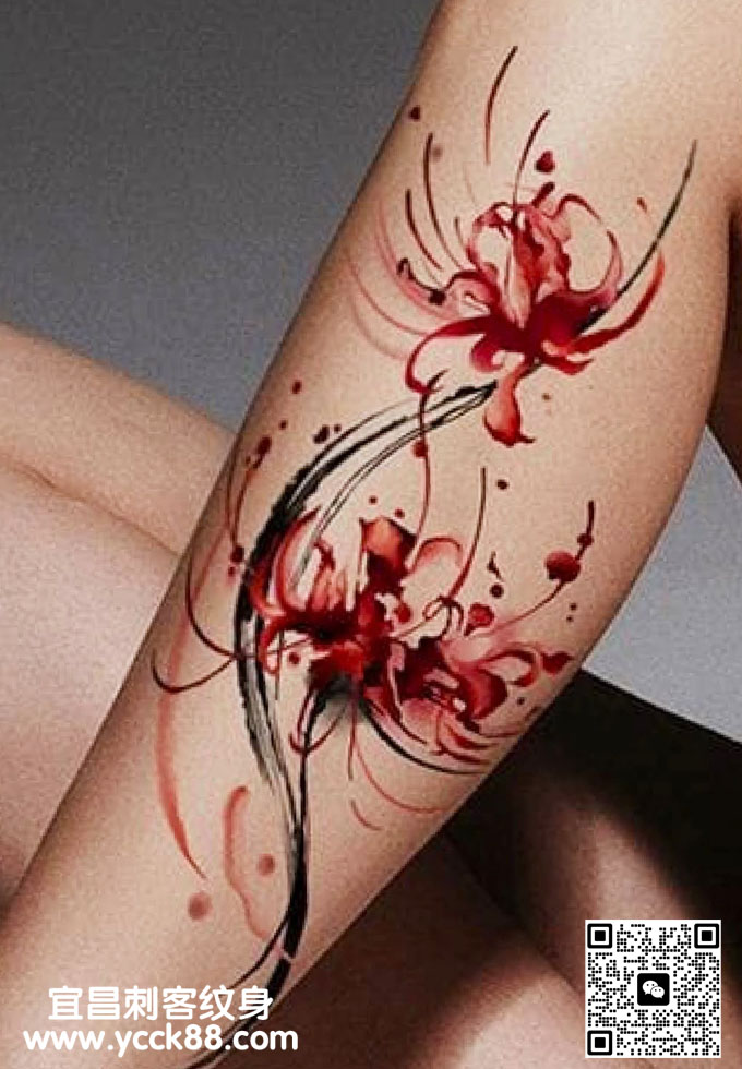 腿部水彩彼岸花纹身 查看更多人体个性纹身图案请登入宜昌刺客纹身网 www.ycck88.com