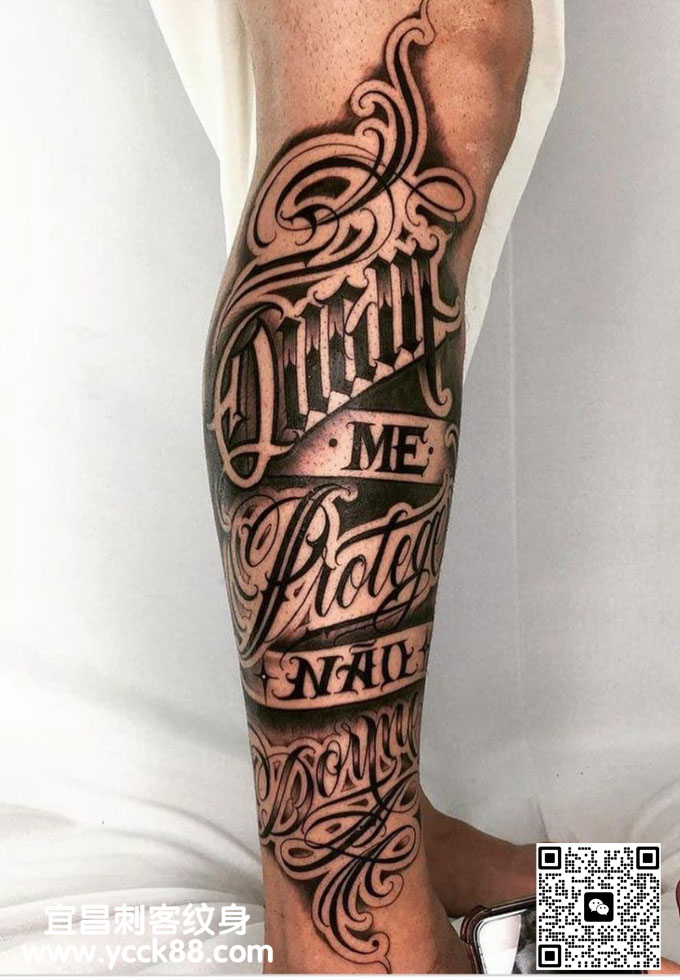 腿部花体字风格纹身 查看更多人体个性纹身图案请登入宜昌刺客纹身网 www.ycck88.com