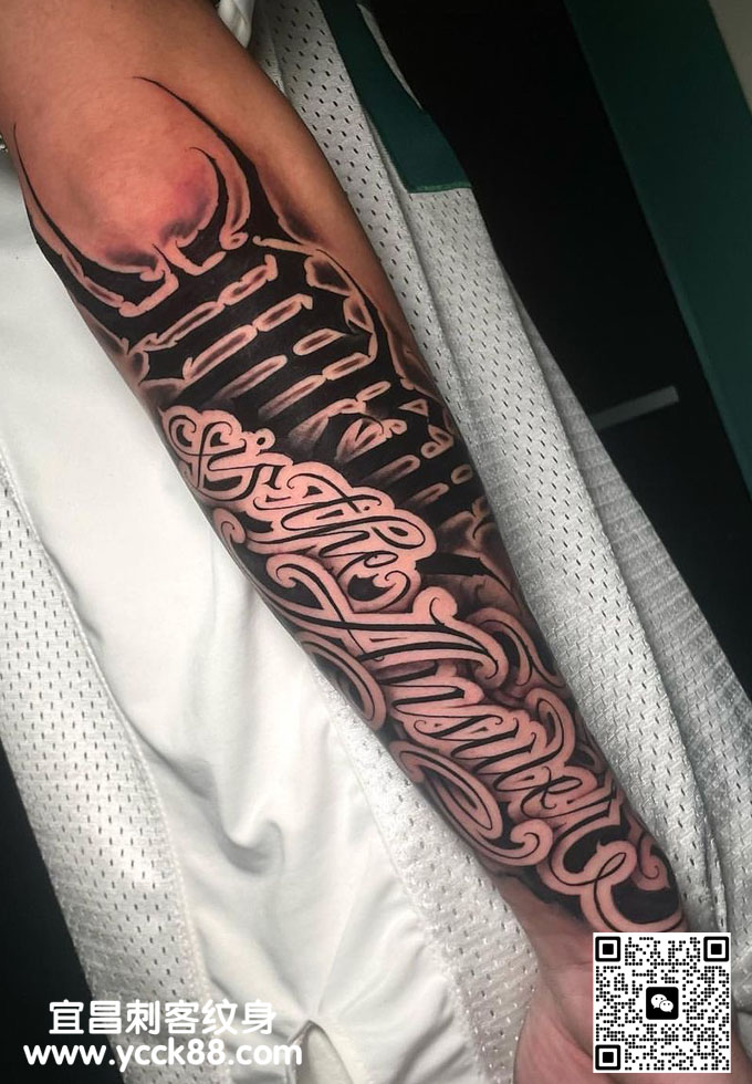 手臂花体字纹身 查看更多人体个性纹身图案请登入宜昌刺客纹身网 www.ycck88.com