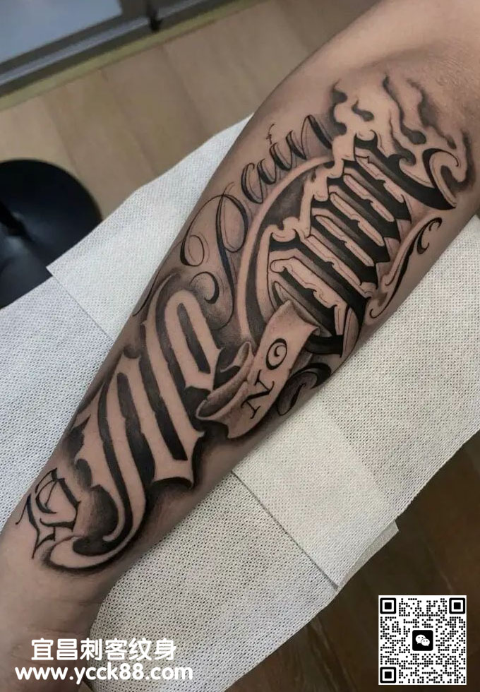 小臂花体字母纹身  查看更多人体个性纹身图案请登入宜昌刺客纹身网 www.ycck88.com