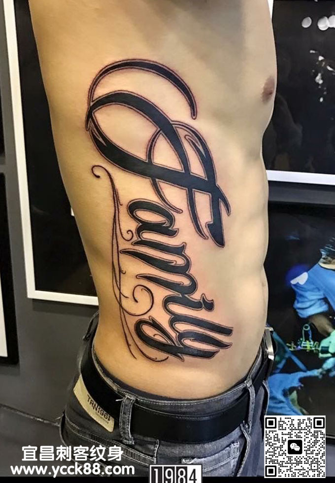 腰侧花体字纹身 查看更多人体个性纹身图案请登入宜昌刺客纹身网 www.ycck88.com
