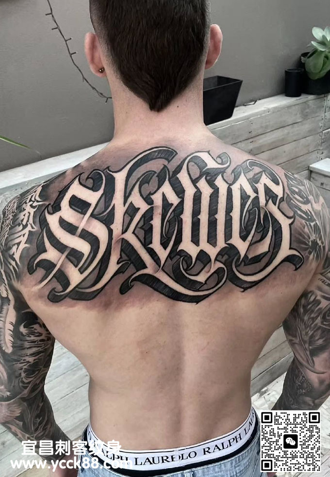 背部花体字母纹身 查看更多人体个性纹身图案请登入宜昌刺客纹身网 www.ycck88.com