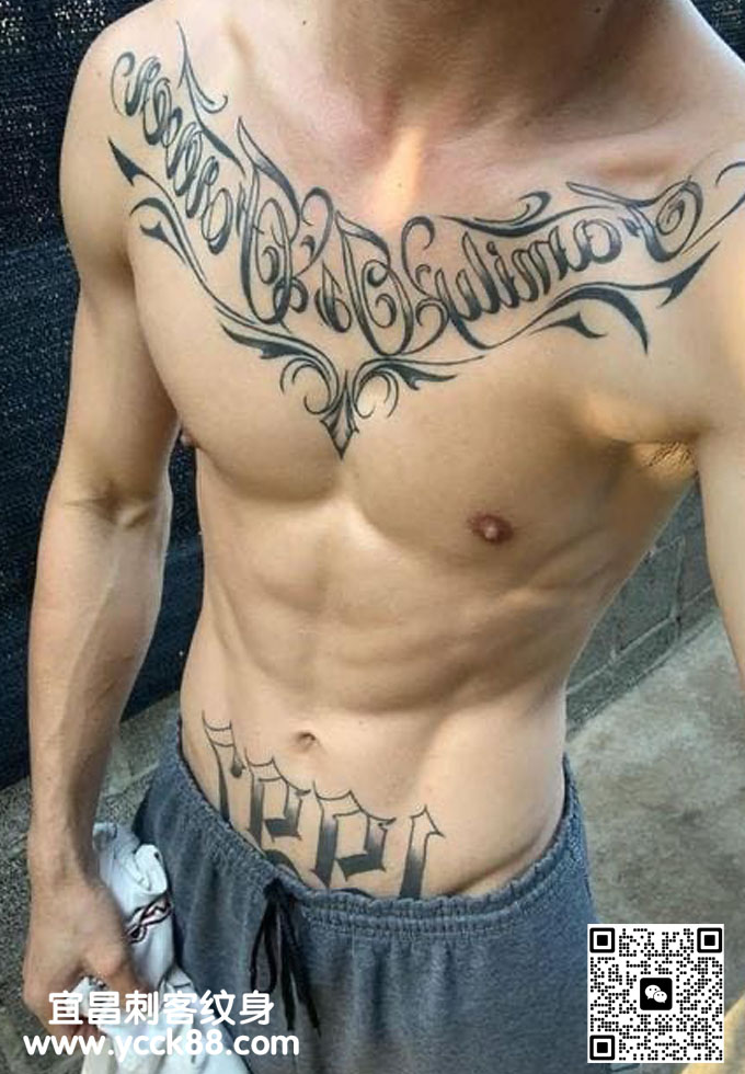 帅哥胸前花体字母纹身  查看更多人体个性纹身图案请登入宜昌刺客纹身网 www.ycck88.com