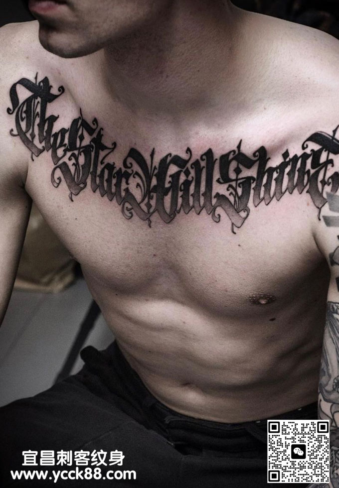 帅哥胸前花体字母纹身 查看更多人体个性纹身图案请登入宜昌刺客纹身网 www.ycck88.com