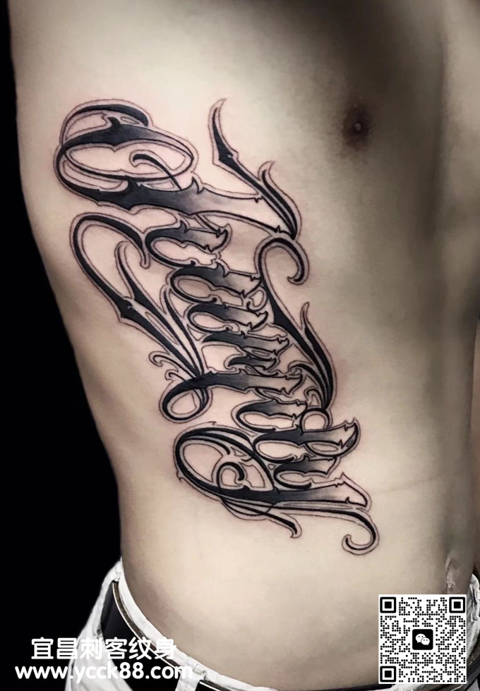 腰侧花体字纹身  查看更多人体个性纹身图案请登入宜昌刺客纹身网 www.ycck88.com