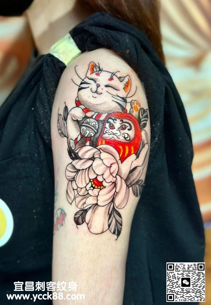 胳膊日式招财猫纹身 查看更多人体个性纹身图案请登入宜昌刺客纹身网 www.ycck88.com