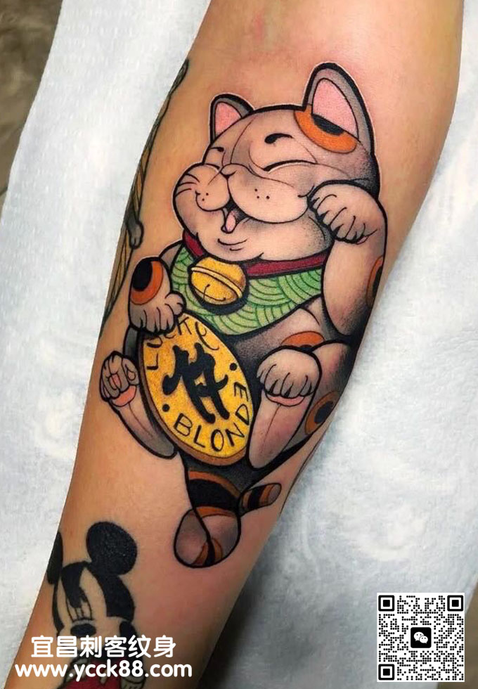 手臂招财猫纹身 查看更多人体个性纹身图案请登入宜昌刺客纹身网 www.ycck88.com