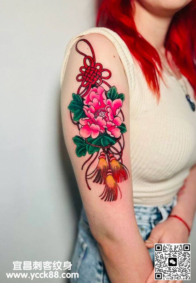 美女胳膊日式牡丹花纹身 查看更多人体个性纹身图案请登入宜昌刺客纹身网 www.ycck88.com