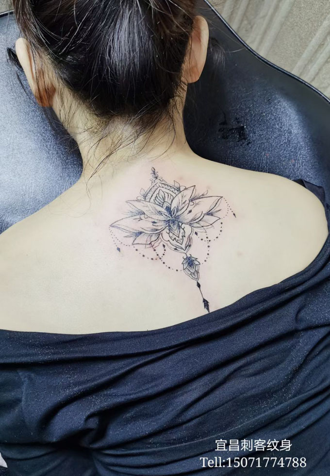 背部黑灰莲花纹身 更多纹身图案请登入宜昌刺客纹身网 www.ycck88.com
