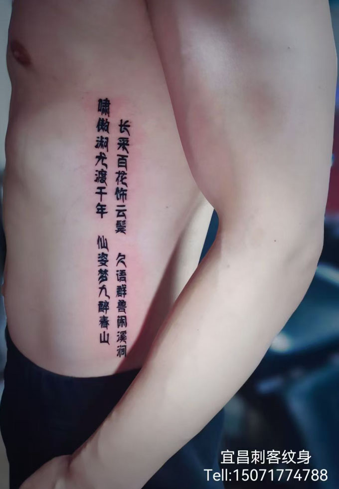 腰侧黑灰文字纹身 更多纹身图案请登入宜昌刺客纹身网 www.ycck88.com