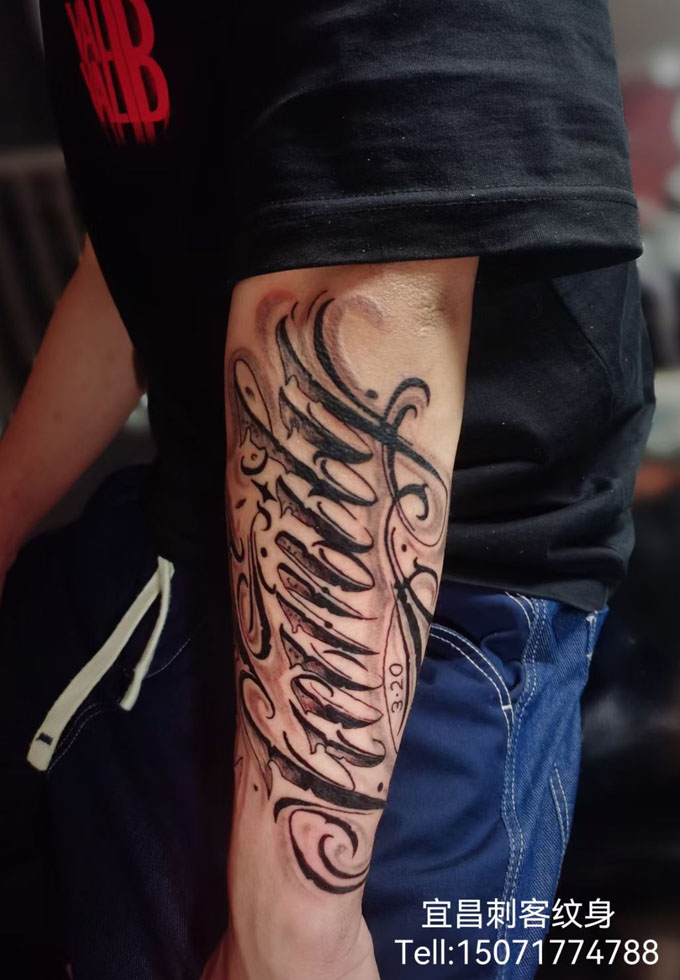 手臂花体字纹身 更多纹身图案请登入宜昌刺客纹身网 www.ycck88.com