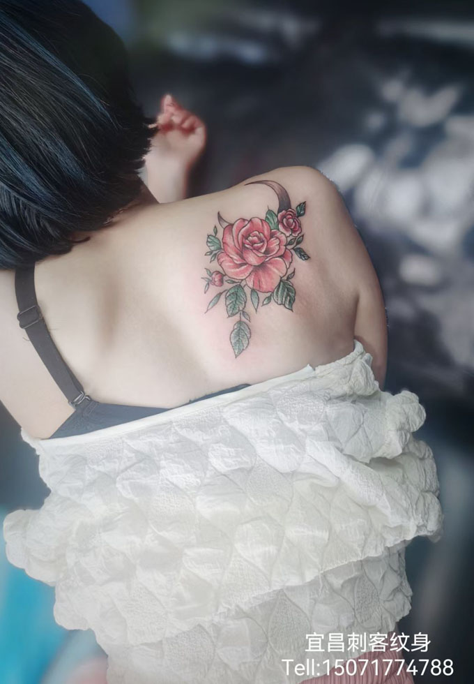 背部彩色玫瑰花纹身 更多纹身图案请登入宜昌刺客纹身网 www.ycck88.com